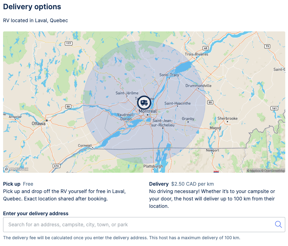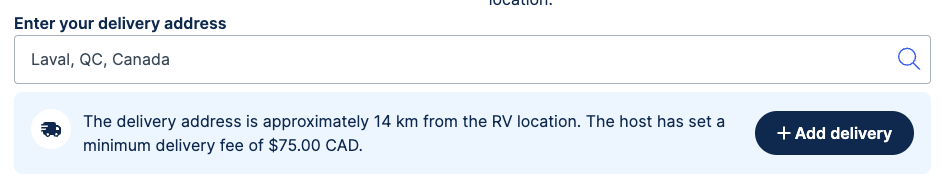 Delivery fees are determined by each host and reflect their time, distance, and effort. Hosts can set a price per mile or kilometre as well as a minimum delivery fee. If your delivery address is close enough to the RV that the price per mile/km falls below the minimum delivery fee, the minimum fee will apply: