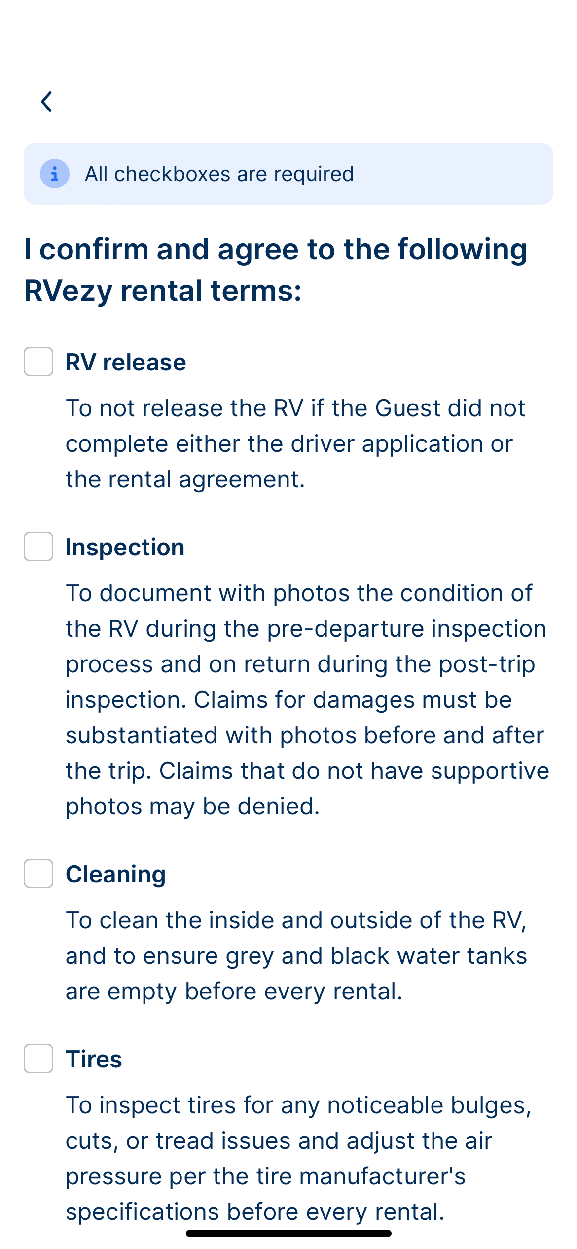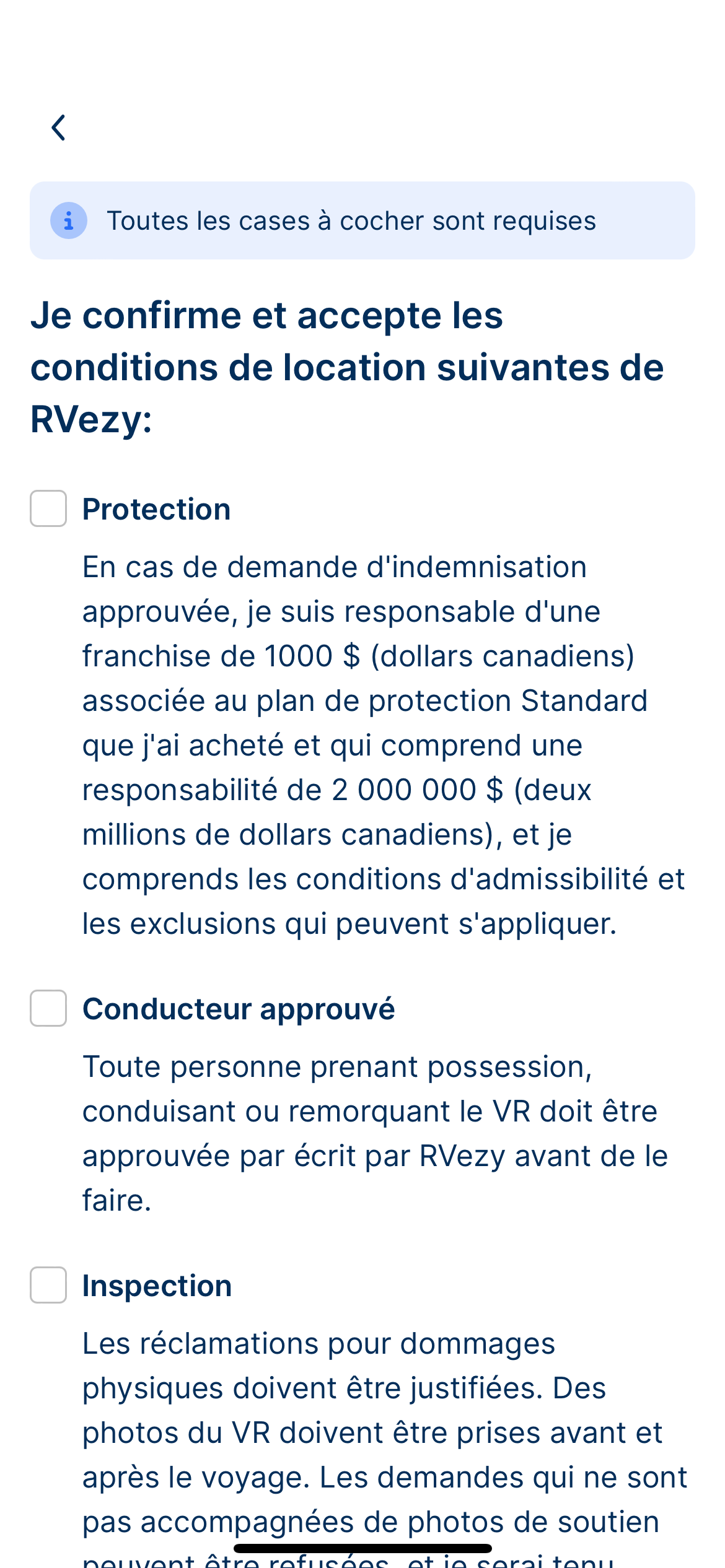 Les deux parties doivent effectuer l'inspection de départ à l'aide de l'application RVezy. L'inspection permettra de noter l'état du VR à l'aide de photo, des niveaux des réservoirs et du kilométrage.