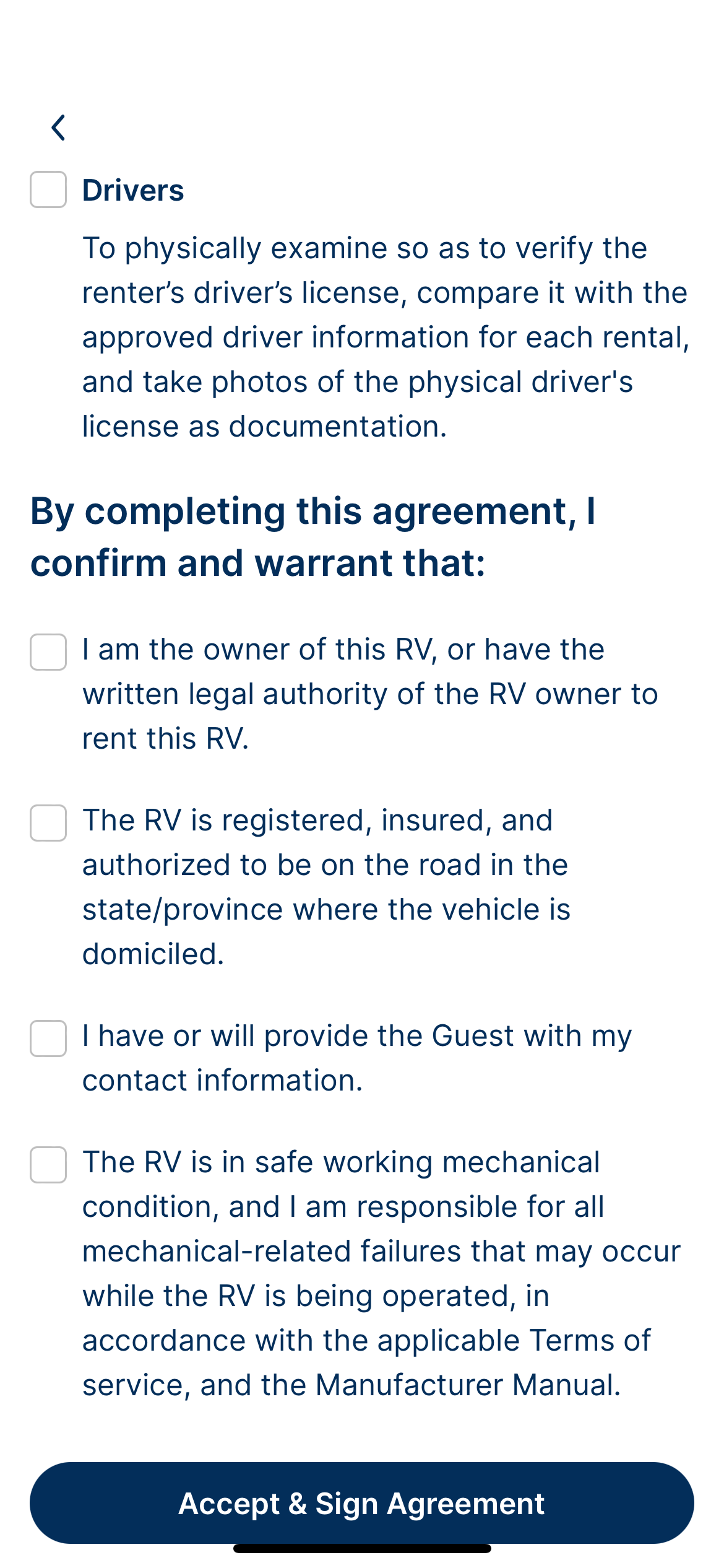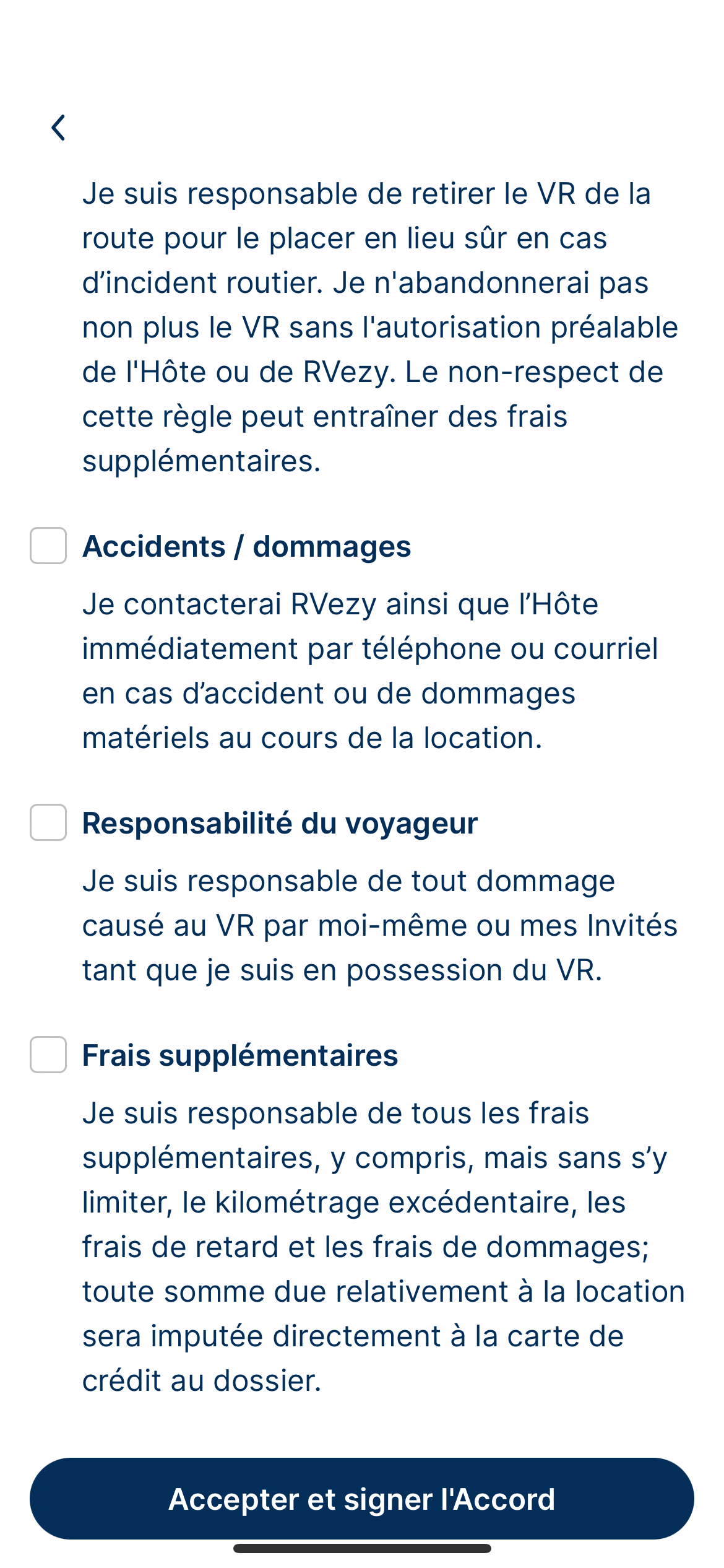 Le contrat de location RVezy simplifie le processus de location pour les hôtes et les voyageurs, en définissant les responsabilités et en garantissant le bon déroulement des inspections au départ et au retour. Il s'agit d'une version numérique de nos conditions d'utilisation, nécessaire pour toutes les réservations.