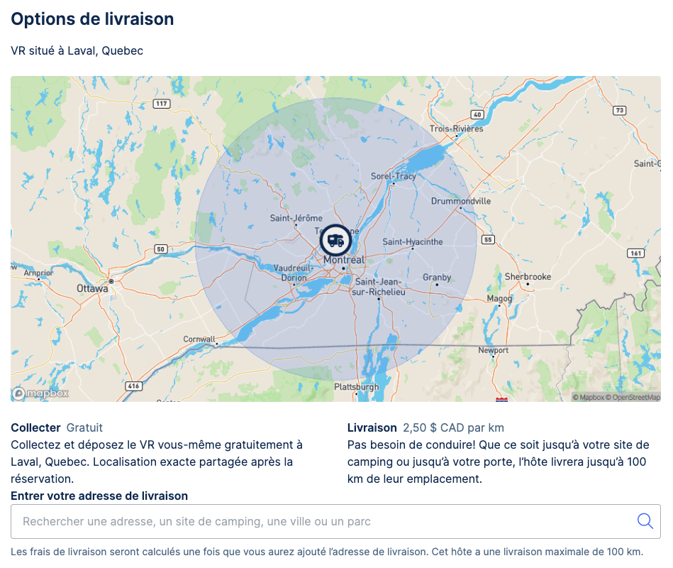 Certains hôtes proposent la livraison dans le cadre de leurs services de location, et vous pouvez filtrer votre recherche par Livraison. Cela vous permet de trouver rapidement les VR que l'hôte est prêt à conduire ou à remorquer jusqu'à l'endroit de votre choix.