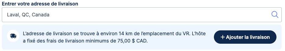 Les frais de livraison sont déterminés par chaque hôte et reflètent le temps, la distance et les efforts nécessaires. Les hôtes peuvent fixer un prix par kilomètre, ainsi qu'un montant minimum pour les frais de livraison. Si votre adresse de livraison est suffisamment proche du VR pour que le prix par km soit inférieur au montant minimum des frais de livraison, ce dernier s'appliquera: